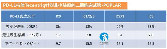 值得注意的是:這個臨床結果發現無論PD-L1表達狀態如何,使用Tecentriq都會比使用多西他賽的患者OS更長。之前就有Tecentriq針對非小肺癌的二期臨床POPLAR 研究,發現PD-L1表達量越高,Tecentriq的效果越好。IC0代表PD-L1陰性,IC1/2/3代表PD-L1陽性,IC3是強陽性。具體的臨床數據如下: