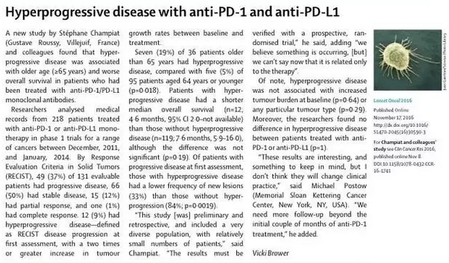 Champiat在接受采訪時說:“這只是初步回顧性研究數據、而且研究群體多樣復雜,標本數量小”,“所以,對資料數據解讀應與前瞻隨機設計的實驗資料對比解讀判斷。而且,我們目前雖然不能說這種超進展情況與治療直接有關,但相信某種情況確實是在發生著”。