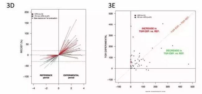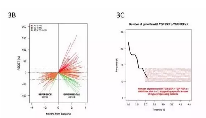為了識別出癌癥疾病進展了的群體,研究人員計算了滿足以下條件的患者數:治療后的TGR> 治療前TGR x t,其中t是整數閾值(從1到5)。t為2,3,4,5的就是疾病高度進展了的患者(HPD)。