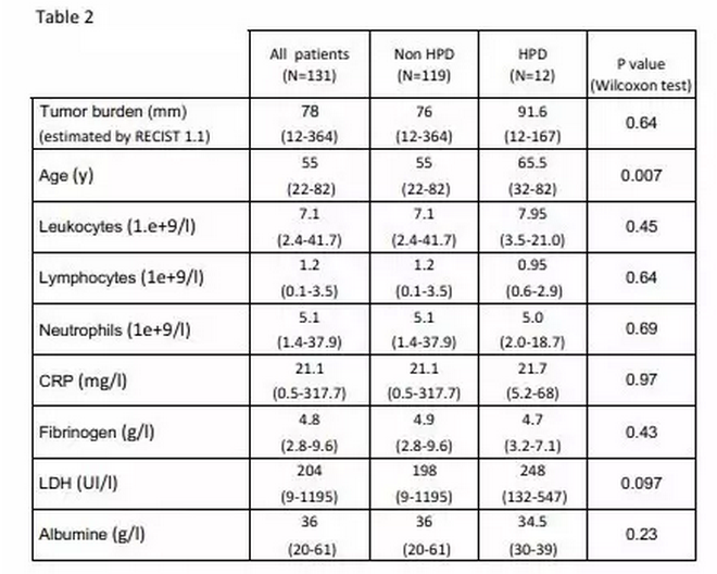 我們觀察到HPD相比非HPD患者年齡更高,這是非常值得重視的。這可能是老年患者與年輕患者有著不同的免疫學背景的原因,比如T細胞共刺激/共抑制蛋白表達,以及更高的炎癥細胞因子的濃度。同時,這與之前三個獨立報道的三期臨床實驗中老年人從藥物中受益較少的結果是一致的,這其中的機制非常值得研究。