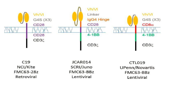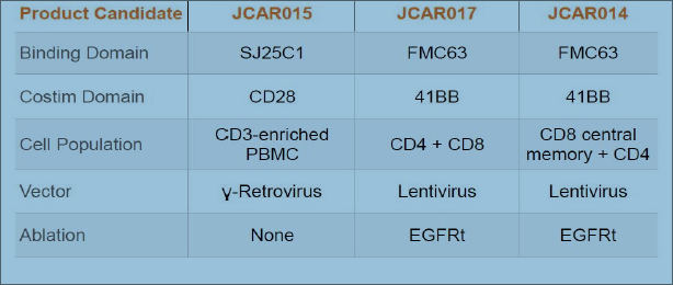 Juno Therapeutics (JUNO)則與上述的三家醫(yī)學(xué)機(jī)構(gòu)合作。在2016 6月ASCO上報(bào)道的臨床研究中,51名復(fù)發(fā)或難治性(r / r)急性淋巴細(xì)胞白血病(ALL)成年患者用環(huán)磷酰胺或氟達(dá)拉濱/ 環(huán)磷酰胺,然后輸注JCAR015。隨訪(fǎng)研究觀察到90%的完全緩解率(CR)。然而在同年7月6日,JCAR015在Ⅱ期臨床試驗(yàn)中導(dǎo)致2例患者腦水腫死亡而被叫停。JUNO認(rèn)為是由于CAR-T治療前用藥氟達(dá)拉濱引起。但是去除氟達(dá)拉濱后繼續(xù)臨床試驗(yàn),11月23日又出現(xiàn)了三個(gè)腦水腫死亡病例,JUNO不得不終止JCAR015臨床試驗(yàn),痛失了在CAR-T的領(lǐng)先地位。JUNO將其重心轉(zhuǎn)向其它產(chǎn)品,JCAR17 和 JCAR14等。它們的區(qū)別見(jiàn)圖9。