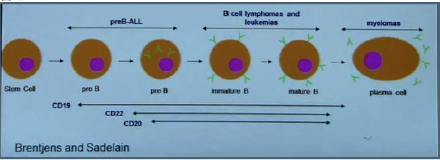 從圖8中看出,CD19在pre-B 和 成熟B細(xì)胞,包括正常和惡性增殖的B細(xì)胞表達(dá), 但是淋巴干細(xì)胞和成熟漿細(xì)胞沒(méi)有CD19。帶有抗CD19 scFv 的CAR-T 細(xì)胞可以攻擊pre-B 和成熟B細(xì)胞而不傷害淋巴干細(xì)胞,保留了淋巴干細(xì)胞的再生功能。使用抗CD19的CAR-T細(xì)胞進(jìn)行