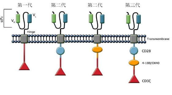 細(xì)胞內(nèi)信號(hào)轉(zhuǎn)導(dǎo)區(qū)主要為CD3ζ或FcεRIγ含有免疫受體酪氨酸活化基序(immunoreceptor tyrosine-based activation motifs, ITAM,)以及第二刺激信號(hào)CD28或者其它分子,4-1BB, OX40等正向協(xié)同刺激信號(hào)。根據(jù)CAR結(jié)構(gòu)的進(jìn)化,有第一代,第二代和第三代。幾代CAR-T的區(qū)別在于細(xì)胞內(nèi)信號(hào)轉(zhuǎn)到區(qū)連入了不同的正向協(xié)同刺激信號(hào):第一代CAR(左)由單鏈抗體通過(guò)跨膜區(qū)域與胞內(nèi)信號(hào)傳導(dǎo)區(qū)(ITAM)相連, ITAM通常為CD3ζ或FcεRIγ; 第二代CAR(中)的胞內(nèi)信號(hào)轉(zhuǎn)導(dǎo)區(qū)引入了共刺激分子, 主要為CD28 或4-BB; 第三代CAR(右)同時(shí)引入了兩個(gè)共刺激分子, 主要為CD28加上4-BB 或OX40。早期的實(shí)驗(yàn)證明了CAR-T 的可行性,然而第一代CAR 只能引起短暫的T 細(xì)胞增殖和較低的細(xì)胞因子分泌,不能提供長(zhǎng)時(shí)間的T 細(xì)胞擴(kuò)增信號(hào)和持續(xù)的體內(nèi)抗腫瘤效應(yīng)。依照T 細(xì)胞活化的雙信號(hào)學(xué)說(shuō),T 細(xì)胞的激活和增殖需要兩個(gè)共刺激信號(hào);第二代、第三代CAR 引入了共刺激分子信號(hào)序列,旨在提高T 細(xì)胞的細(xì)胞毒活性、增殖性與存活時(shí)間,并且促進(jìn)細(xì)胞因子的釋放。