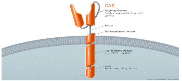 典型CAR的結(jié)構(gòu)由胞外抗原結(jié)合區(qū)、跨膜區(qū)域和胞內(nèi)信號(hào)轉(zhuǎn)導(dǎo)區(qū)組成。其中胞外抗原結(jié)合區(qū)來(lái)源于單克隆抗體的單鏈抗體 (single chain fragment variable. scFv),單鏈抗體是由輕鏈 (VH) 和重鏈 (VL)通過(guò)連接而形成的。scFv是CAR結(jié)構(gòu)里的第一個(gè)關(guān)鍵部位,它能識(shí)別腫瘤特異性抗原,即所說(shuō)的靶點(diǎn),比如CD19, EGFR等,而不是需要加工遞呈出來(lái)的抗原多肽。因此這樣的結(jié)構(gòu)解決了兩大問(wèn)題:靶向性問(wèn)題和繞開(kāi)抗原遞呈的問(wèn)題。(圖4,5)