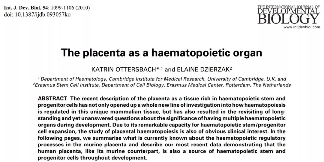 2017:從妊娠第15周開始胎盤絨毛膜就含有造血干細胞