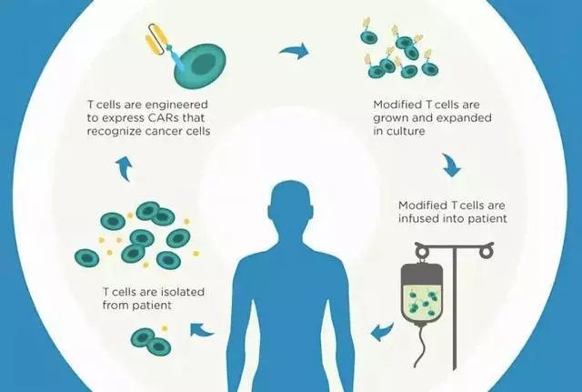 近兩年還有一個非常熱門的細胞治療的方法叫CAR-T技術,簡單來說它就是一個人工制造的殺傷性細胞。我們知道細胞殺傷的時候,它要能夠找到腫瘤的靶標,但在人體的免疫系統當中能夠精確識別腫瘤的這種靶細胞還是非常少的,所以科學家就考慮能不能給這些殺傷細胞裝上一雙眼睛、裝上一根天線讓它更準確識別腫瘤細胞,這樣提高了殺傷的準確性和效率都。