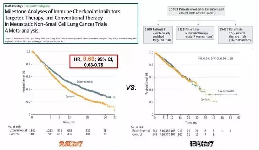 2017年,JAMA ONC曾經發過一篇經典文章,通過對非小細胞肺癌的25個臨床試驗,2萬多名患者的大數據分析,發現參與免疫療法和靶向療法的患者,生存曲線非常不同。