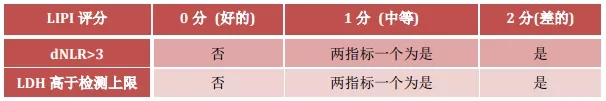 LIPI是綜合了兩個(gè)血液檢查指標(biāo):dNLR(中性粒細(xì)胞/淋巴細(xì)胞百分比)和LDH(乳酸脫氫酶)。具體的計(jì)算方法也非常簡(jiǎn)單:如果dNLR大于3同時(shí)LDH高于檢測(cè)上限,得分是2,預(yù)后較差;如果dNLR小于3,同時(shí)LDH不高于上限,得分是0,預(yù)后較好;中間狀態(tài)得分是1,屬于中等水平。如下圖所示: