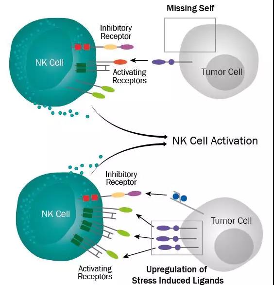 有兩類腫瘤細胞會激活NK細胞的殺傷作用,一種是丟失了MHC I受體的,這類細胞可以逃脫T細胞的殺傷,但因為丟掉了NK細胞抑制信號而成為了NK細胞消滅的目標。