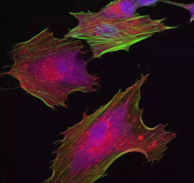 綠色為細胞骨架,紫色為細胞核,紅色為細胞質蛋白。