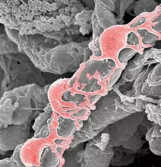 圖中灰色管狀為毛細血管,哪里有血管哪里就有間充質干細胞(紅)。