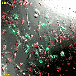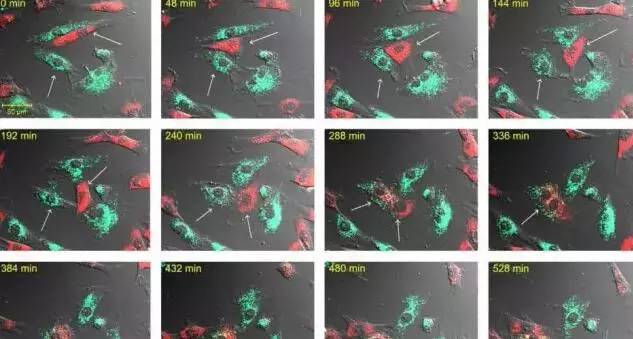 活細胞染為紅色,死亡的心肌細胞染為青色,間充質干細胞不斷遷移,箭頭所指部位間充質干細胞逐漸與死亡細胞融合成為雙核,400分鐘時死亡的心肌細胞開始奇跡般地復活。