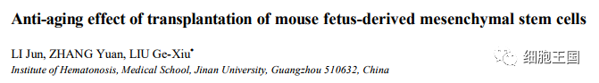 2010年暨南大學醫學院血液病研究所李軍研究小組,在間充質干細胞抗衰老作用的動物實驗中發現,干細胞移植組存活日期明顯長于對照組,移植3個月后評價心功能的指標,心脾質量指數,器官組織學衰老程度評分結果以及血生化指標皆優于對照組,證實移植干細胞能有效地延緩衰老進程。