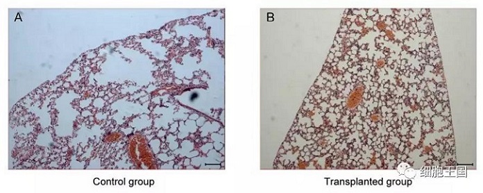 未移植干細胞的對照組肺氣腫改變明顯:氣腔擴大,正常肺泡結構破壞