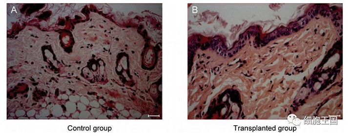 對照組皮膚表皮各層界限不清楚,真皮層成纖維細胞數量減少,膠原纖維變細,毛囊數明顯減少,皮下脂肪層變薄;干細胞移植組表皮組織結構相對較完整,細胞分層較清晰。