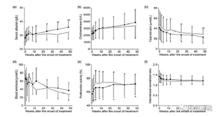 302醫院王福生嘗試利用臍帶間充質干細胞治療失代償期肝硬化(終末期肝硬化),在輸注了四次間充質干細胞后(四周一次),50周肝功明顯改善。