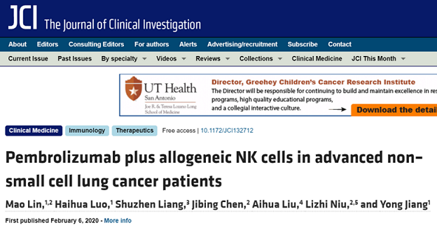 2020年5月,這個(gè)設(shè)想由國內(nèi)的研究團(tuán)隊(duì)率先實(shí)錘,證實(shí)PD-1(派姆單抗,K藥)加同種異體NK細(xì)胞在先前接受過治療的晚期NSCLC患者中安全有效。并發(fā)表在國際頂級期刊《The Journal of Clinical Investigation》上。
