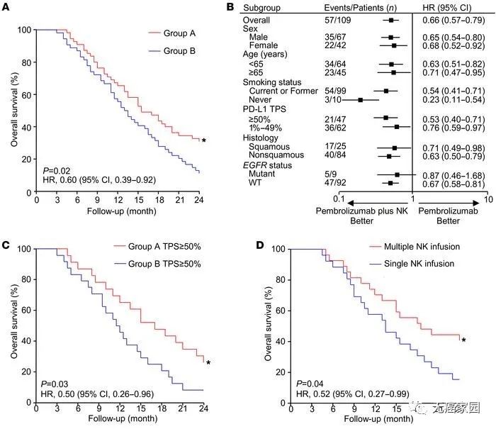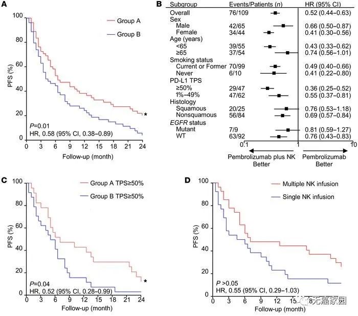 在PD-L1 ≥50%的患者中,A組患者的中位OS為17.0個(gè)月,比B組患者的中位OS更長(圖C)。此外,接受多療程N(yùn)K細(xì)胞輸注的患者的中位OS明顯長于僅接受單療程N(yùn)K細(xì)胞輸注的患者(圖D)