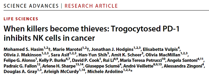 近日,該研究以:When killers become thieves: Trogocytosed PD-1 inhibits NK cells in cancer 為題發表在了 Science 子刊 Science Advances 上 。