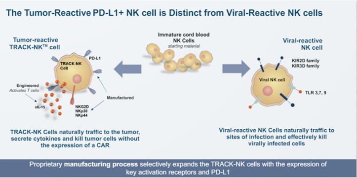 CYTO-102是一種由PD-L1陽性腫瘤反應(yīng)性NK細(xì)胞(TRACK-NK?) 組成的通用型細(xì)胞療法,通過對NK細(xì)胞進(jìn)行基因修飾以分泌高水平的可溶性IL-15。IL-15是一種免疫信號分子,在患者自身免疫系統(tǒng)的最佳抗腫瘤反應(yīng)中十分重要。在CYTO-102的制造過程中,IL-12、IL-18及其他信號分子可以誘導(dǎo)工程化NK細(xì)胞表達(dá)PD-L1,PD-L1陽性TRACK-NK細(xì)胞可以自然定向到腫瘤微環(huán)境殺死癌細(xì)胞,并調(diào)節(jié)患者自身免疫系統(tǒng)的適應(yīng)性或T細(xì)胞反應(yīng)。