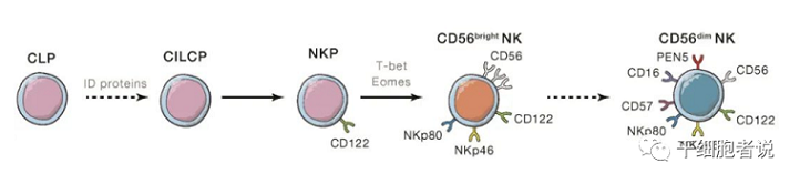 NK細胞在機體內由CD34+造血祖細胞(HPC)發育而來,是一個連續的過程,共同淋巴細胞祖細胞(CLPs)逐漸下調CD34,上調CD56,促使NK細胞分化與成熟[圖2]。