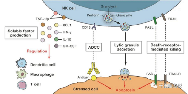 作為人體抗擊癌癥的第一道防線,NK細胞大多數具有抗腫瘤細胞毒性。NK細胞在防線中的作用主要包括: