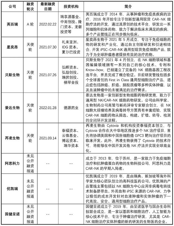 國內CAR-NK企業融資進展(數據來源:啟信寶; 康橙投資)