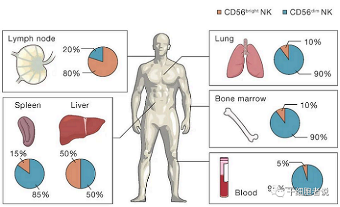 NK細胞主要存在于淋巴結、骨髓、外周血、肺、脾臟、肝臟等器官內;CD56的表達可以分兩個NK細胞亞群,CD56dim和CD56bright,其中CD56- NK細胞具有抗腫瘤細胞毒性,并且兩個亞群都能夠產生細胞因子。[圖3]。