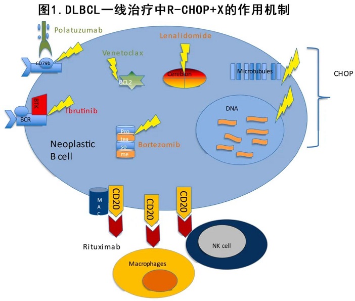 另一個(gè)不同且有吸引力的策略是在標(biāo)準(zhǔn)R-CHOP中加入新型生物藥物 (‘X’),無(wú)論是在誘導(dǎo)期還是作為維持期 (圖1)。