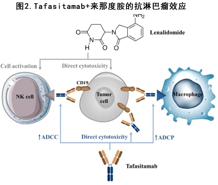 Tafasitamab 是一種 Fc 增強(qiáng)的人源化抗CD19單抗,在 B 細(xì)胞惡性腫瘤中表現(xiàn)出活性,并與來(lái)那度胺具有協(xié)同效應(yīng),來(lái)那度胺能夠增強(qiáng)自然殺傷細(xì)胞介導(dǎo)的、抗體依賴性的細(xì)胞毒(圖2)。II 期多中心單臂 L-MIND 研究(表2中的[56])在不適合移植的R/R DLBCL 中評(píng)估了tafasitamab + 來(lái)那度胺 (tafa + LEN) 聯(lián)合治療。該療程包括tafasitamab + 來(lái)那度胺最長(zhǎng)12個(gè)月,隨后 tafasitamab 單藥治療直至疾病進(jìn)展。該方案非常高效,ORR為61% (CR 43%),中位緩解持續(xù)時(shí)間為21.7個(gè)月且毒性特征合理?;谠摻Y(jié)果,2020年tafasitamab聯(lián)合來(lái)那度胺獲得FDA和EMA加速批準(zhǔn)用于治療不適合移植的R/R DLBCL。