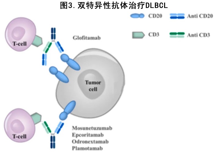 雙特異性抗體 (BsAb) 是識(shí)別兩種特異性抗原或表位的單抗,可使自體 T 細(xì)胞重定向?qū)鼓[瘤細(xì)胞(圖3)。最近已有多個(gè)不同抗 CD20 BsAbs 在R/R DLBCL 進(jìn)行了研究,結(jié)果顯示即使在多難治性患者中也具有良好的活性,并且安全性可控,表現(xiàn)為CRS和神經(jīng)毒性事件的發(fā)生率較低,多為1-2級(jí)。
