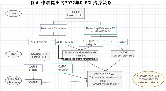鑒于目前新的生物制劑和創(chuàng)新組合的動(dòng)態(tài)格局,作者將2022年治療 DLBCL 的可能策略總結(jié)于圖4,但是正如一首著名歌曲所說(shuō)“這是一個(gè)變革的時(shí)代”( “the times they are a-changing”),這一策略可能需要在不久的將來(lái)隨著正在進(jìn)行的研究發(fā)表結(jié)果而進(jìn)行更新。