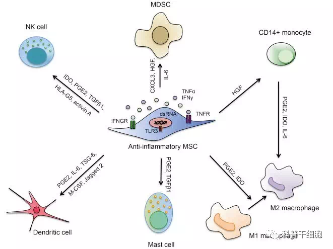 △干細(xì)胞調(diào)控免疫系統(tǒng)示意圖如間充質(zhì)干細(xì)胞在TNFα, IL-1α, IL-1β等促炎因子的刺激下,所分泌的趨化因子(CCL5、CXCL10),生長因子(TGF-β、HGF),細(xì)胞因子(IDO)以及抗炎小分子(PGE2),能抑制炎癥反應(yīng)及炎癥相關(guān)細(xì)胞TH1和TH17、漿細(xì)胞、促炎性M1巨噬細(xì)胞、自然殺傷性細(xì)胞及中性粒細(xì)胞的遷移、增殖。