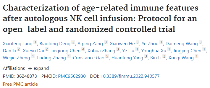 2022年9月,上海長征醫院輸血科、上海交通大學免疫學研究所等單位聯合在《Frontiers in Immunology》上發表了一篇名為“Characterization of age-related immune features after autologous NK cell infusion: Protocol for an open-label and randomized controlled trial”的研究結果表明,自體NK細胞能夠顯著改善T細胞衰老和耗竭。