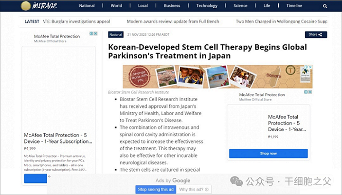 2023 年 11 月 20 日 ,韓國成體干細胞研究所 Biostar 干細胞研究所(所長:Jeongchan Ra 博士)宣布,通過給予自體干細胞治療帕金森病的再生醫學技術使用專利技術在靜脈和脊髓腔內培養的脂肪干細胞已獲得日本厚生省的批準,并將于 12 月在東京新宿診所開始治療。