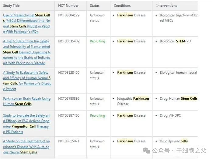 截至目前,在美國國立衛生研究院的臨床試驗注冊庫clinicaltrials.gov網站上注冊的有關干細胞治療帕金森病的臨床研究近60項。